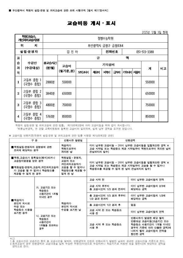 학원 등록 번호(제2985호) 및 교습비 게시 자료 페이지 정보 작성자 관리실장 댓글 0건 조회 42회 작성일 25-03-12 20:48 목록 답변 본문 학원 등록 번호 및 교습비 게시 자료 이전글학년별 교육내용 25.03.12 댓글 0 댓글목록 등록된 댓글이 없습니다.